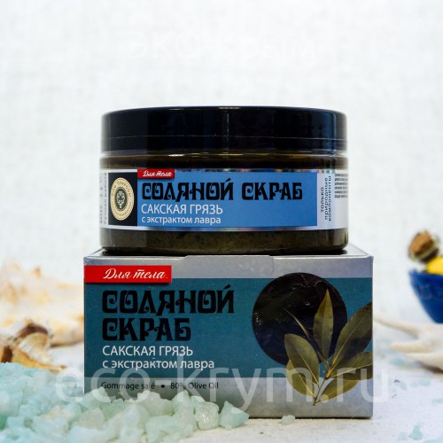 Состав: Морская соль, оливковое масло, репейное масло, масло жожоба, грязь Сакского озера, экстракт лавра, эфирные масла розмарина, базилика, шалфея, бергамота.